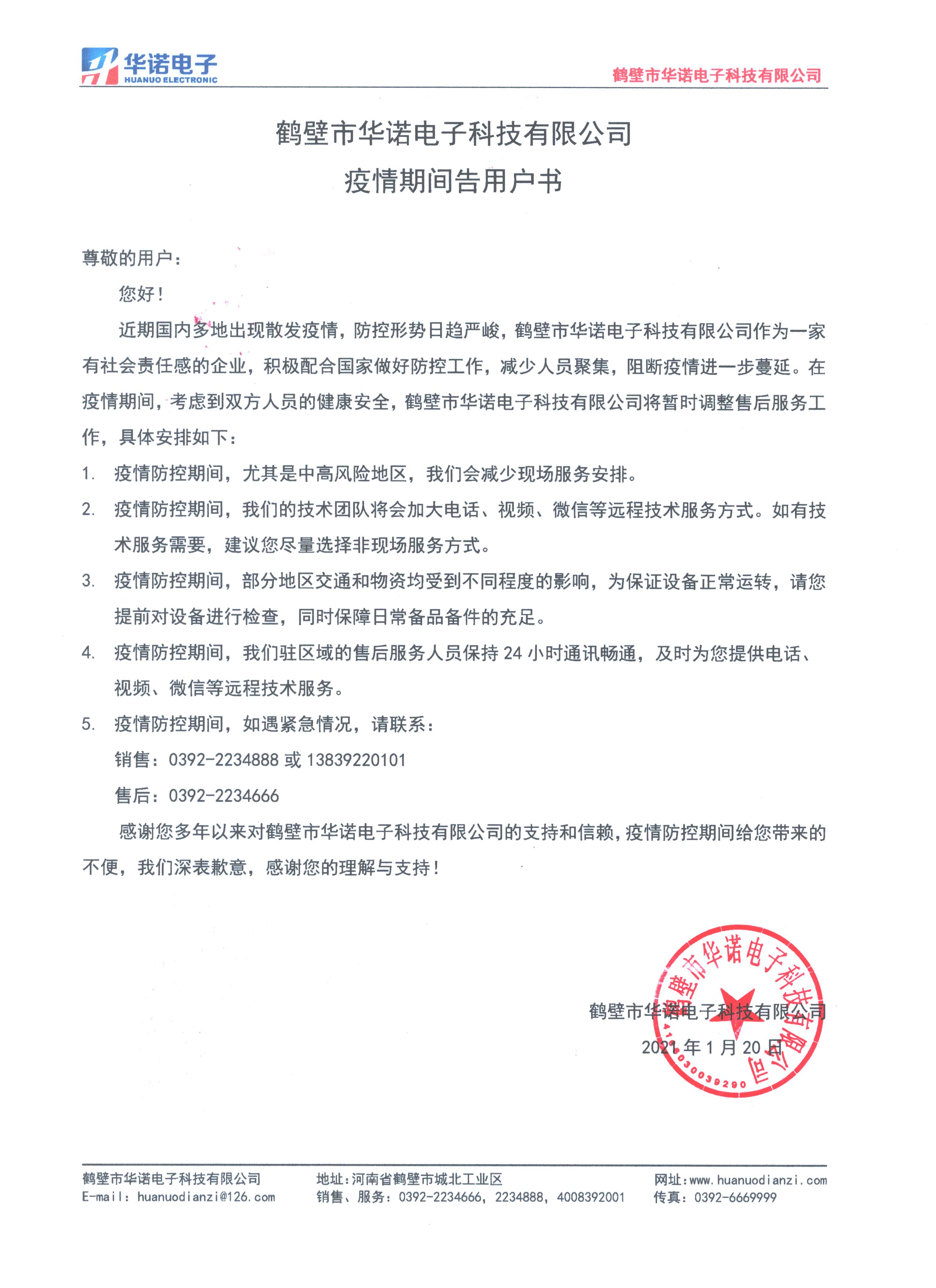 感謝您多年以來對鶴壁市華諾電子科技有限公司的支持和信賴,疫情防控期間給您帶來的不便,我們深表歉意,感謝您的理解與支持!