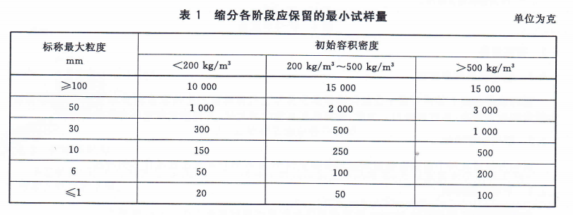4.1樣品縮分后的最小試樣量:表1給出了每一縮分階段應保留的最小樣品質量,它主要取決于物料的標稱最大粒度和容積密度。標稱最大粒度可通過篩分試驗確定,容積密度的測定方法見附錄C,部分物料的初始容積密度參見附錄D。除了表1中說明的最小質量之外,還應保證縮分后的樣品量能滿足實際試驗的需要。
